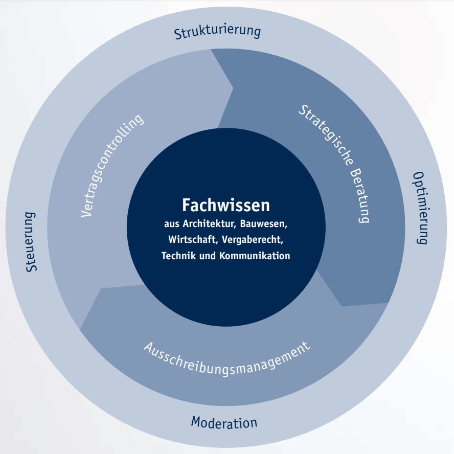 Unsere Stärken liegen in der reibungslosen Steuerung komplexer Beschaffungsvorgänge sowie in der fachübergreifenden Beratung. Bitte klicken Sie auf die Abschnitte mit einem Pfeil, um mehr über unsere Tätigkeiten in der jeweiligen Projektphase zu erfahren.