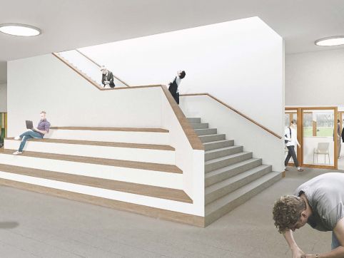 In dem dreigeschossigen Schulgebäude gruppieren sich die Klassen- und Differenzierungsräume einer Jahrgangsstufe gruppieren sich um großzügige Flurflächen mit hoher Aufenthaltsqualität (sogenannte Cluster) und werden durch Fachunterrichtsräume für Naturwissenschaften, „Wirtschaft, Arbeit, Technik“ (WAT), Musik/Kunst sowie eine Aula/Speiseraum, eine Schülerküche und eine Schülerbibliothek ergänzt. Der Verwaltungsbereich mit Lehrerzimmer ist zentral im Erdgeschoss angeordnet.